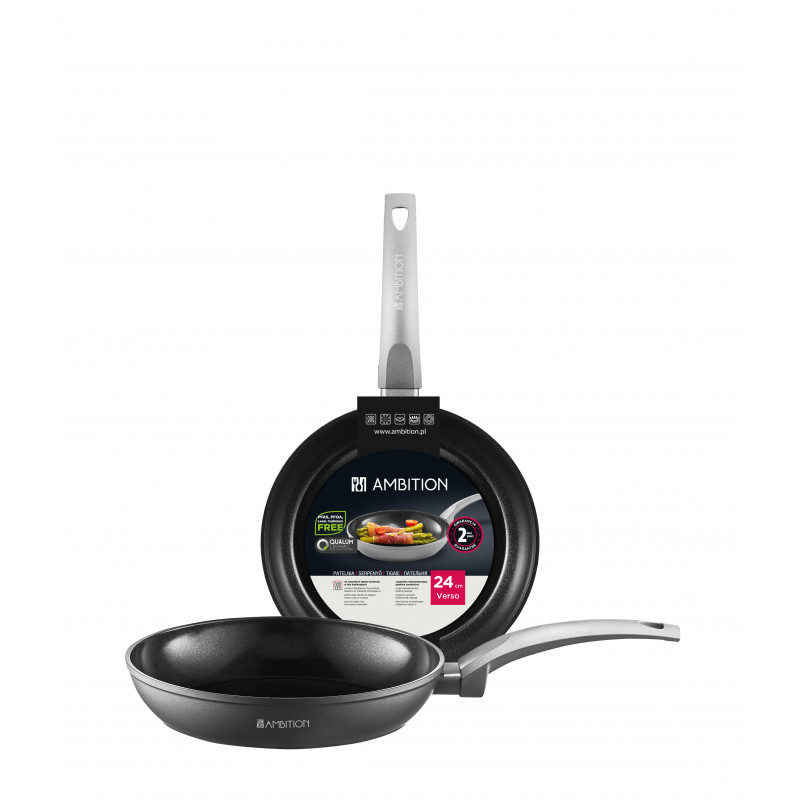Linia Verso to wyjątkowe naczynia wykonane z odkuwanego aluminium odpornego na odkształcenia. Klasyczna szaro-srebrna kolorystyka na zewnątrz. Wewnątrz nieprzywierająca powłoka ceramiczna Qualum Ceramic. Powłoka ceramiczna oparta jest na technologii Xerogel, wykonana z naturalnych minerałów, pozbawiona jest PFAS i PTFE, a także PFOA, kadmu i ołowiu, a więc bardziej przyjazna środowisku i bezpieczniejsza dla zdrowia. Idealnie gładka powierzchnia zapewnia doskonałe właściwości nieprzywierające i ułatwia czyszczenie. Rączki pokryte są specjalnym materiałem Soft Touch, zapewniają pewne trzymanie w dłoni. Produkty z linii Verso przystosowane są do używania na wszystkich typach kuchenek, w tym indukcyjnych. Patelnie i garnki objęte są 2-letnią gwarancją na wady fabryczne i materiałowe.