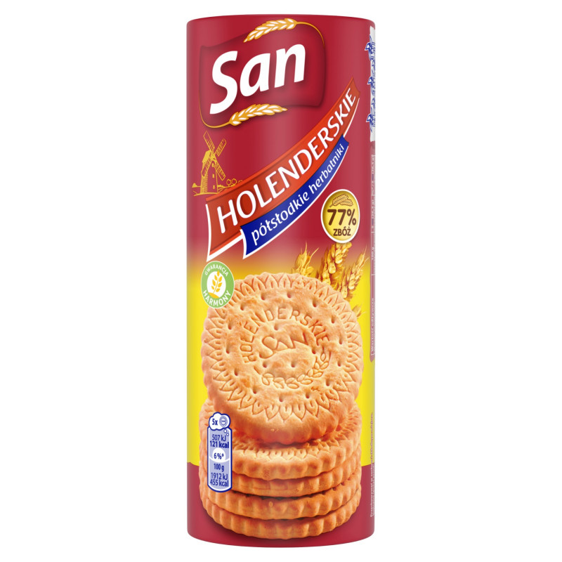 Ciastka San Holenderskie to delikatne półsłodkie herbatniki. Idealnie sprawdzą się jako przekąska dla całej rodziny i poczęstunek dla gości do filiżanki ulubionej kawy. Produkty marki SAN to m.in. biszkopty, kruche ciastka i wafelki, które konsumenci wybierają od lat, dzieląc się ze swoimi najbliższymi w domowym zaciszu.