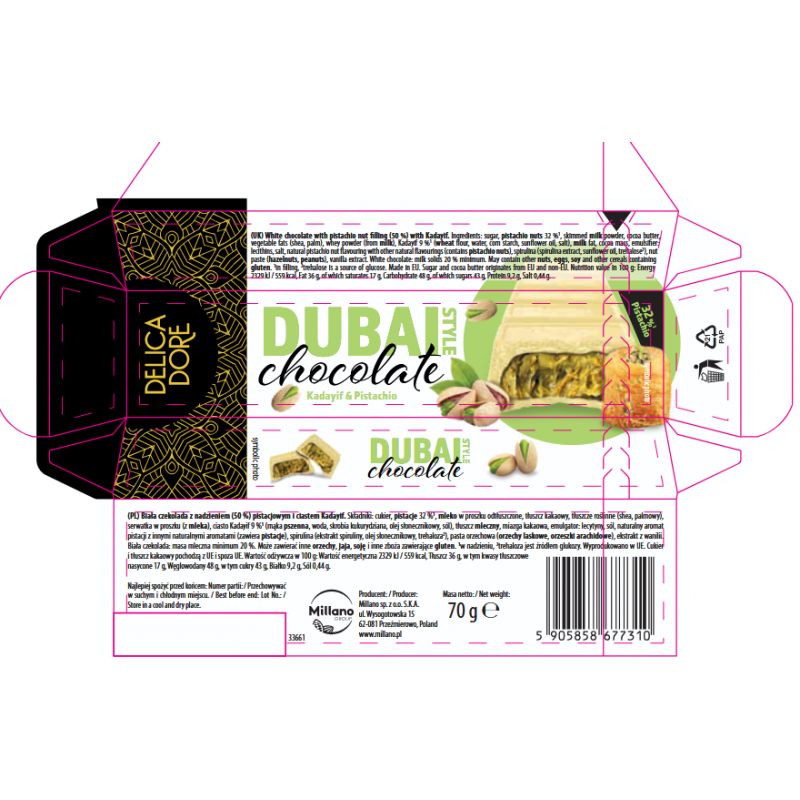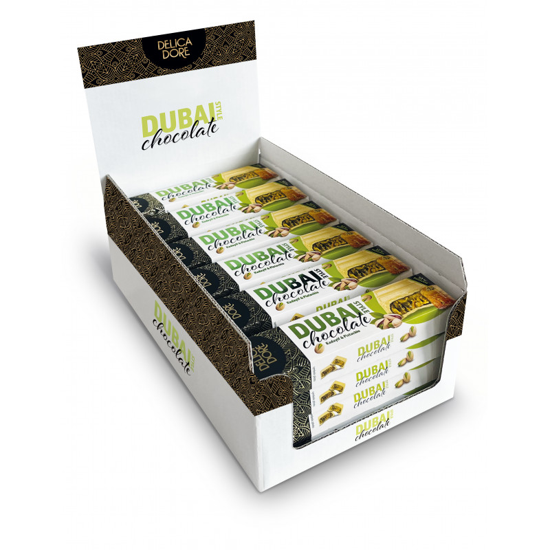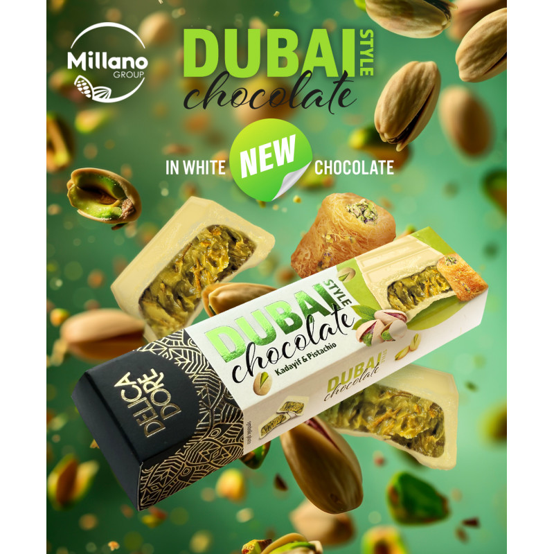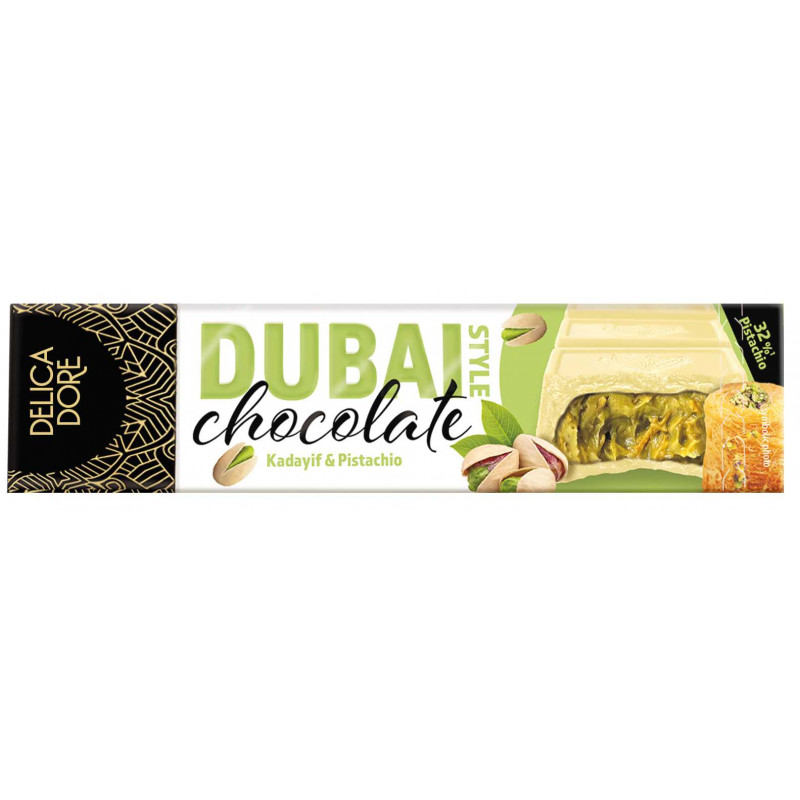 Biała czekolada z nadzieniem (50 %) pistacjowym i ciastem Kadayif.