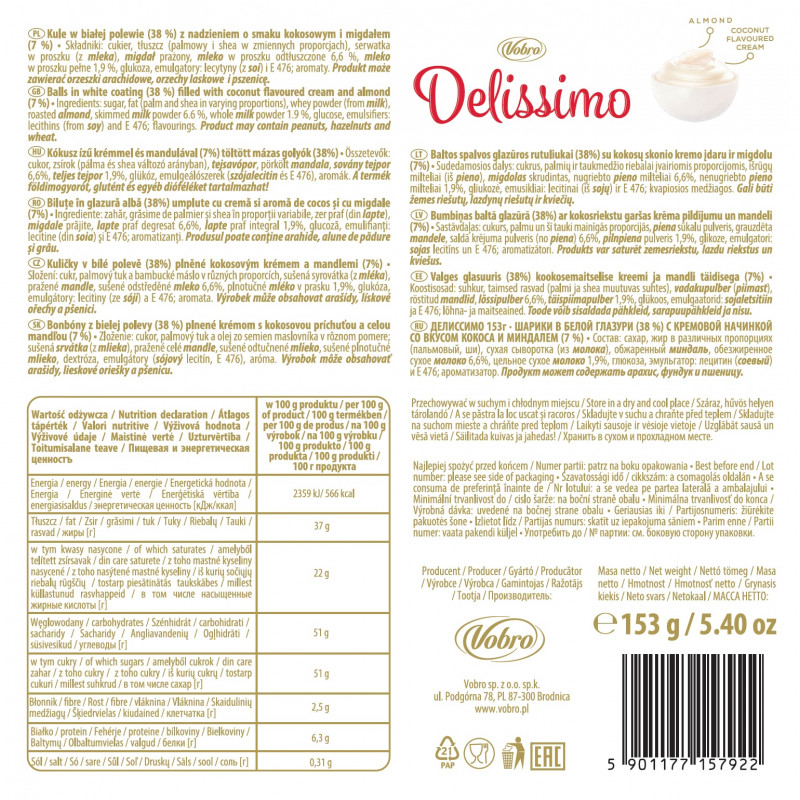 Składniki: cukier, tłuszcz (palmowy i shea w zmiennych proporcjach), serwatka w proszku (z MLEKA), MIGDAŁ prażony, MLEKO w proszku odtłuszczone 6,6 %, MLEKO w proszku pełne 1,9 %, glukoza, emulgatory: lecytyny (z SOI) i E 476; aromaty. PRODUKT MOŻE ZAWIERAĆ ORZESZKI ARACHIDOWE, ORZECHY LASKOWE I PSZENICĘ.