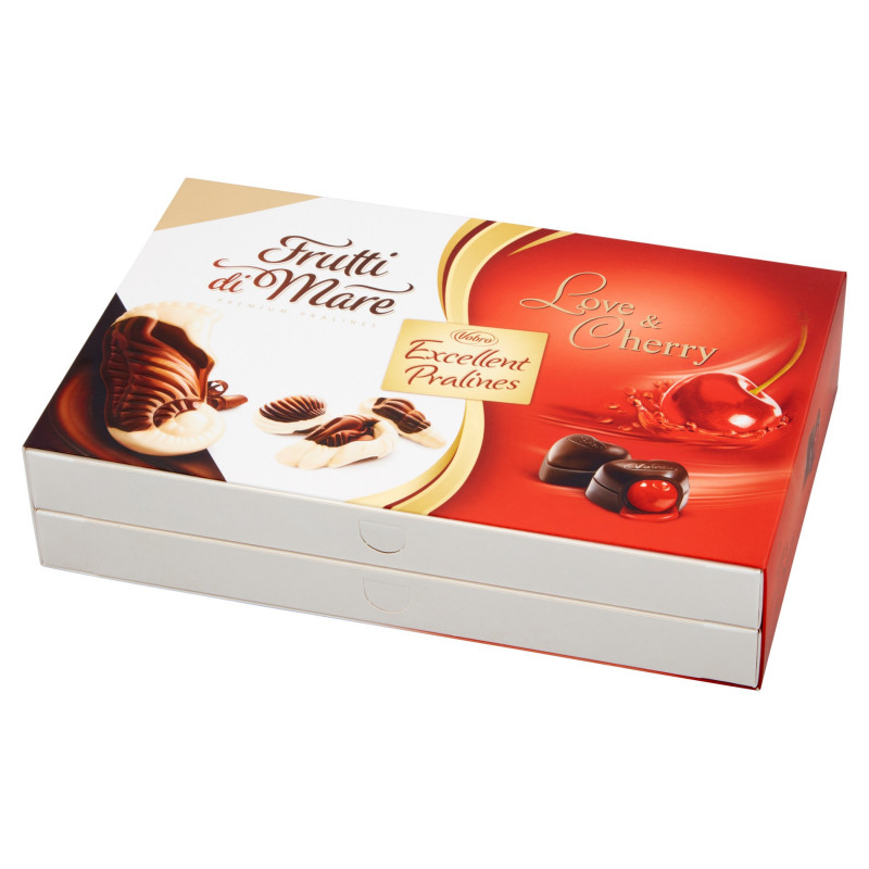 Frutti di Mare - Praliny z białej czekolady (34%) i czekolady (9%) nadziewane kremem (57%) o smaku karmelowym, orzechowym, mlecznym i kakaowym.