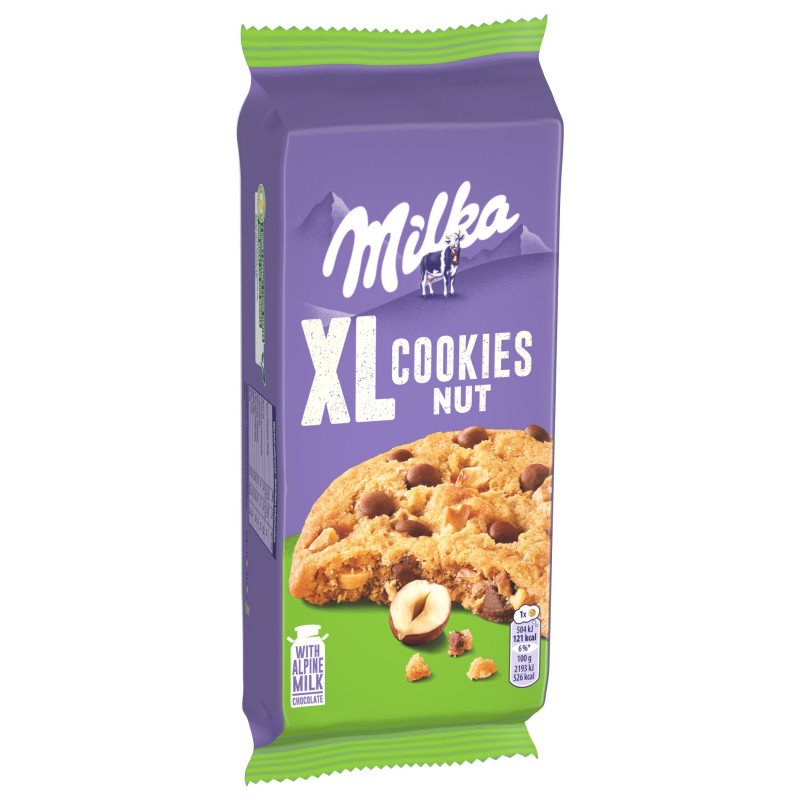 Milka XL Cookies Nut to duże, chrupiące ciastko, pełne kawałków mlecznej czekolady Milka i orzechów laskowych.