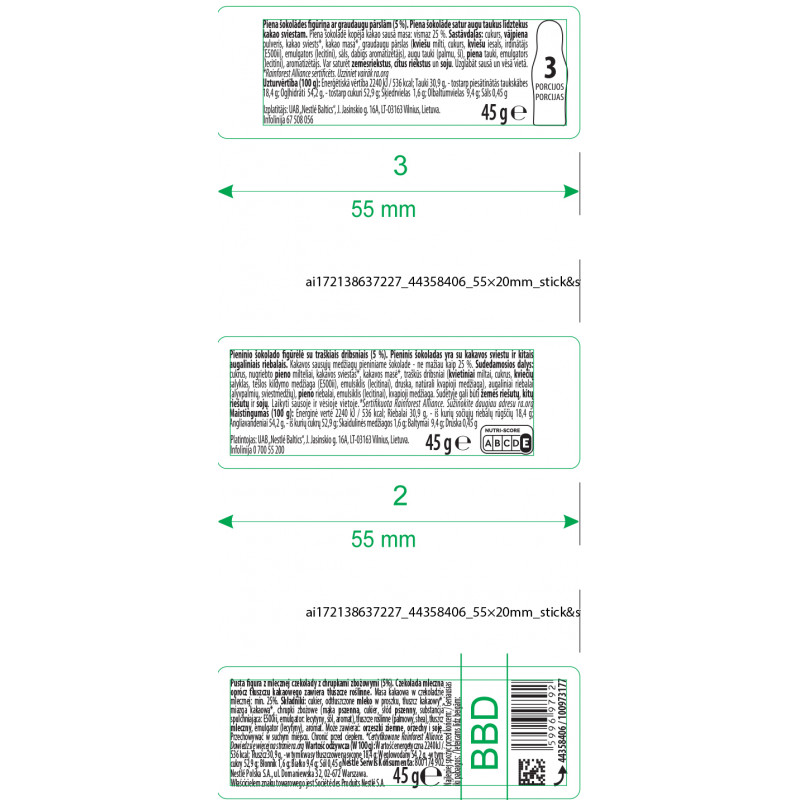 Pusta figura z mlecznej czekolady z chrupkami zbożowymi (5%). Czekolada mleczna oprócz tłuszczu kakaowego zawiera tłuszcze roślinne. Masa kakaowa w czekoladzie mlecznej: min. 25%.