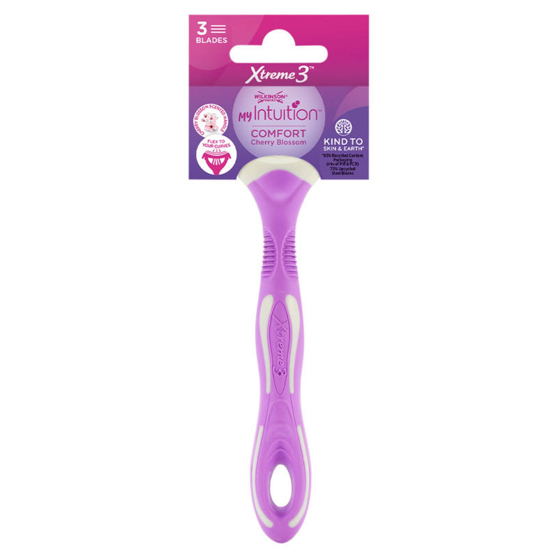 Maszynka jednorazowa z 3 ruchomymi ostrzami i rączką o zapachu kwiatu czereśni. Komfortowe golenie, które skutecznie obejmie wszelkie krągłości i kąty ciała.