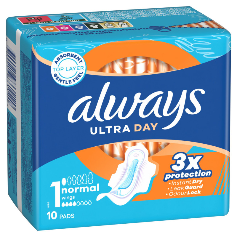 Wybierz odpowiednie rozwiązanie dla siebie, takie jak potrójna ochrona, którą zapewniają podpaski ALWAYS Ultra Day Normal (rozmiar 1) ze skrzydełkami. Podpaski Always z chłonną i delikatną powłoczką wchłaniają wilgoć w kilka sekund dzięki technologii InstantDry, a za sprawą technologii LeakGuard i OdorLock zapobiegają przeciekaniu i nieprzyjemnemu zapachowi. Wyjątkowe skrzydełka ComfortLock zaprojektowano tak, by zapewnić doskonałe dopasowanie do każdego rodzaju bielizny. Dla dodatkowej ochrony w nocy wypróbuj podpaski Always Night w różnych rozmiarach. Podpaski Always Ultra zostały zatwierdzone dermatologicznie przez Skin Health Alliance.