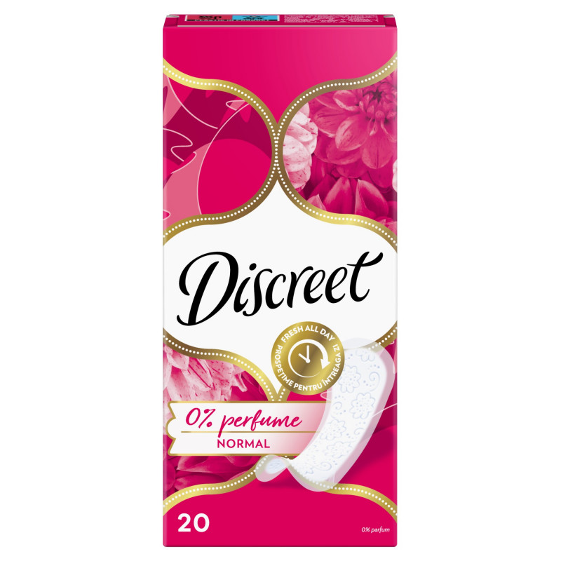 Bezzapachowe wkładki Discreet Normal pomogą Ci czuć się świeżo i pięknie przez cały dzień. Zapewniają pełną ochronę i zabezpieczają bieliznę przed zabrudzeniem. Budowa tej wkładki higienicznej pozwala skórze miejsc intymnych swobodnie oddychać, co zapewnia Ci uczucie świeżości i komfortu aż do 12 godzin. Są tak cienkie, że nawet ich nie poczujesz. Wariant 0% jest całkowicie bezzapachowy. Bez względu na to, co przyniesie Ci dzień, te wkładki sprawią, że wszystko się uda!