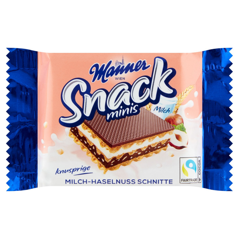 Chrupkie wafle z kremem mlecznym i z kremem z orzechów laskowych (35 %) częściowo w polewie kakaowej (12 %).