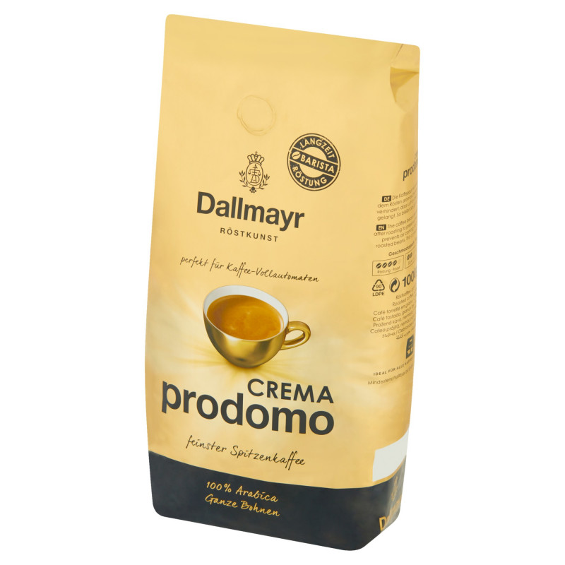 Crema prodomo szczególnie polecamy do ekspresów ciśnieniowych. Dzięki delikatnemu i powolnemu paleniu kawy metodą bębnową udało się zoptymalizować sensorycznie tę najwyższej jakości mieszankę pochodzącej z wyżyn kawy arabica. Dallmayr Crema prodomo została w delikatny sposób uszlachetniona i uwolniona od wielu substancji dających posmak goryczki.