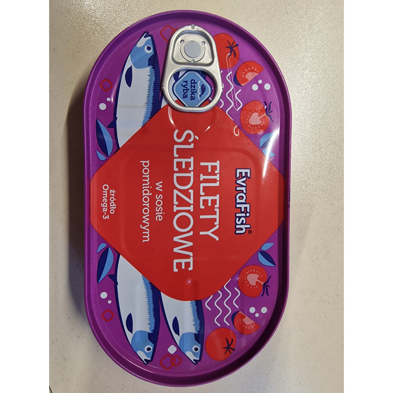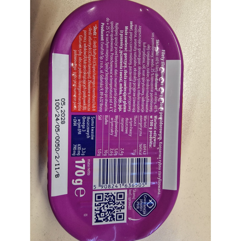 Składniki: 60% filety śledziowe ze skórą ,40% sos pomidorowy: woda ,25% koncentrat pomidorowy ,olej rzepakowy, cukier, skrobia modyfikowana kukurydziana , sól, ocet spirytusowy, substancja zagęszczająca:guma guar ,skrobia ryżowa ,cebula suszona mielona,aromaty przypraw, ekstrakty przypraw (zawierają seler) ,pieprz czarny mielony, pasternak mielony, przyprawy.Może zawierać: gorczycę, zboża,zawierające gluten (z pszenicy, jęczmienia i owsa),mleko, soję, jaja.