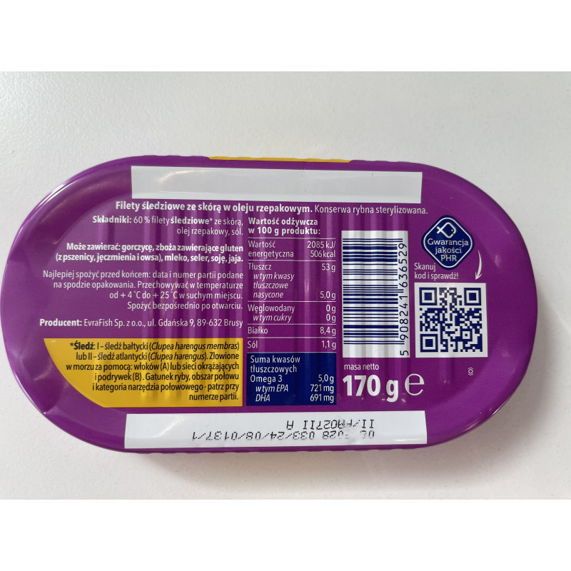 Składniki: 60% filety ze śledzia atlantyckiego ze skórą (Clupea harengus), 40% olej rzepakowy tłoczony na zimno, sól.* Informacja o połowie – patrz nadruk przy numerze partii