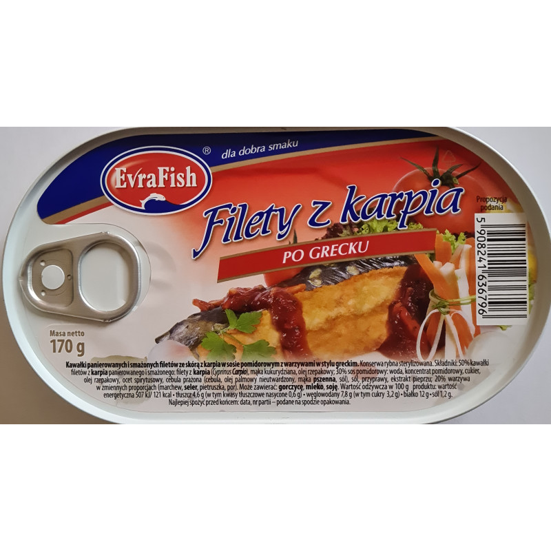 Składniki: 50% kawałki filetów z karpia panierowanego i smażonego: filety z karpia (Cyprinus Carpio), mąka kukurydziana, olej rzepakowy; 30% sos pomidorowy: woda, koncentrat pomidorowy, cukier, olej rzepakowy, ocet spirytusowy, cebula prażona (cebula, olej palmowy nieutwardzony, mąka pszenna, sól), sól, przyprawy, ekstrakt pieprzu; 20% warzywa w zmiennych proporcjach (marchew, seler, pietruszka, por).