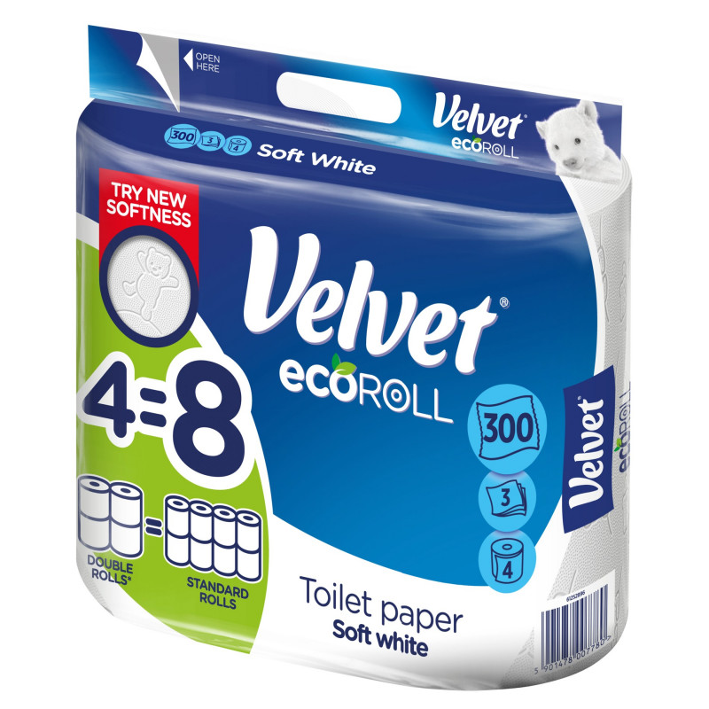 *Długość 4 rolek Velvet Big Roll odpowiada 8 standardowym rolkom papieru Velvet Delikatnie Biały. Wszystkie dane odnoszą się do porównania papieru Velvet Big Roll do standardowego papieru Velvet Delikatnie Biały 8 rolek.