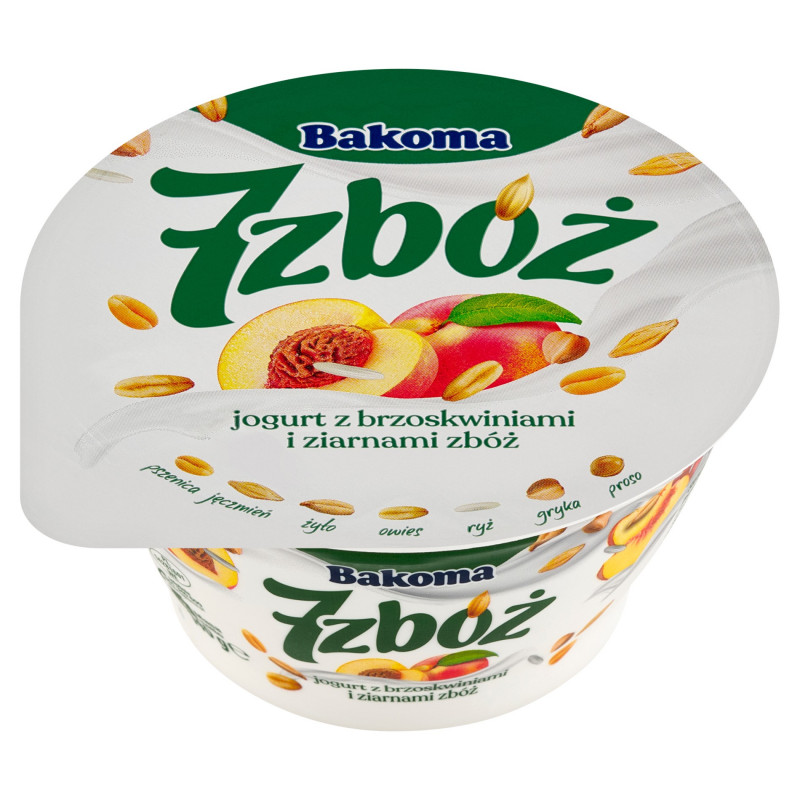 Jogurt z brzoskwiniami i ziarnami zbóż.