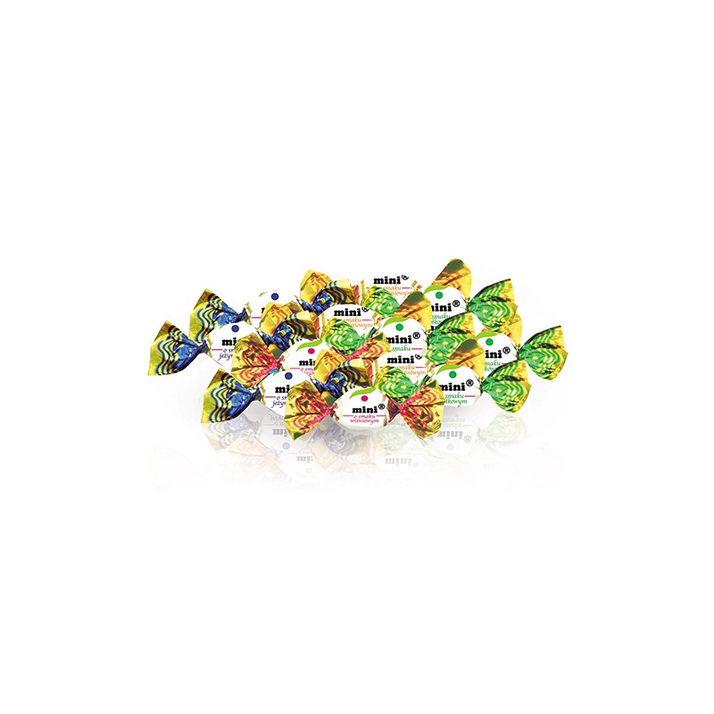 Cukierki mini owocowe. Smak: Brzoskiwniowy, Czereśniowy, Jabłkowy, Jeżyna.