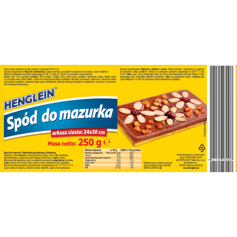 Spód do mazurka o wymiarach 24 x 30 cm, które wystarcza do przygotowania dwóch mazurków o wymiarach 24 x 15 cm.