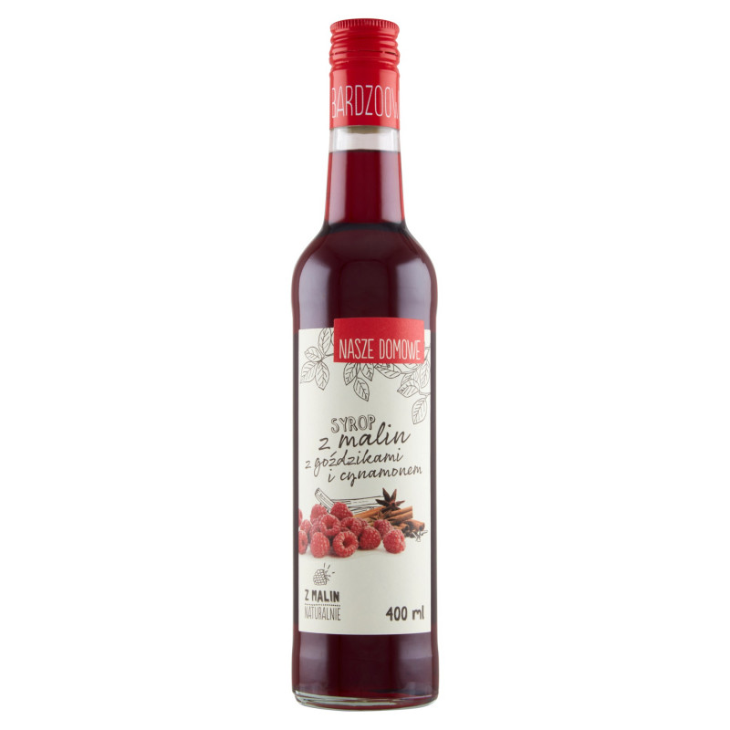 Syrop z malin z goździkami i cynamonem. Produkt pasteryzowany.