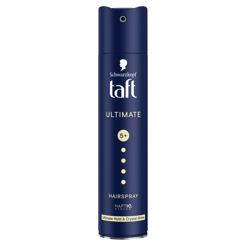 Innowacyjna formuła Schwarzkopf Taft Ultimate nadaje włosom maksymalne utrwalenie i olśniewająco krystaliczny blask oraz jest odpowiedni do każdego rodzaju włosów. Zapewnia długotrwałe utrwalenie bez efektu sklejonych włosów, a jednocześnie łatwo się wyczesuje. Pomaga chronić włosy przed uczuciem suchości i zapewnia mocne utrwalenie stylizacji nawet w trudnych warunkach pogodowych, takich jak wilgoć i wiatr. Lakier do włosów Schwarzkopf Taft posiada innowacyjny system HAPTIQ, który tworzy mikrowiązania i wzmacnia strukturę włosa.