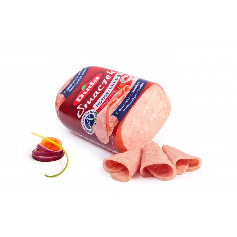 Składniki: mięso wieprzowe 76%, woda, sól, skrobia ziemniaczana, stabilizatory [E451, E262], wzmacniacz smaku [E621], przeciwutleniacz [E316], przyprawy (kminek 0,35%), substancja konserwująca [E250].