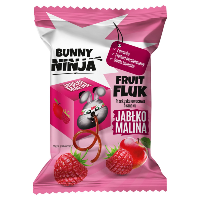 Fruit Fluk o smaku jabłka i maliny to długi zakręcony sznurek naładowany owocami, który powstaje bez dodatku cukru. Innowacyjna forma przekąski Bunny Ninja z pewnością zawróci w głowie każdemu małemu poszukiwaczowi owocowych przygód. Fruit Fluk to nie tylko eksplozja smaków, ale i moc kreatywnej zabawy. Cienki i długi sznureczek można wyciągać, przeciągać, urywać i do woli się nim bawić, zapewniając sobie i najbliższym same pozytywne wrażenia. W opakowaniu znajduje się przeurocze pudełeczko, opatrzone wesołą minką Bunnego, która momentalnie wywoła u każdego szeroki uśmiech na twarzy, a wypełniony słodkością kartonik gwarantuje niekończącą się owocową zabawę.